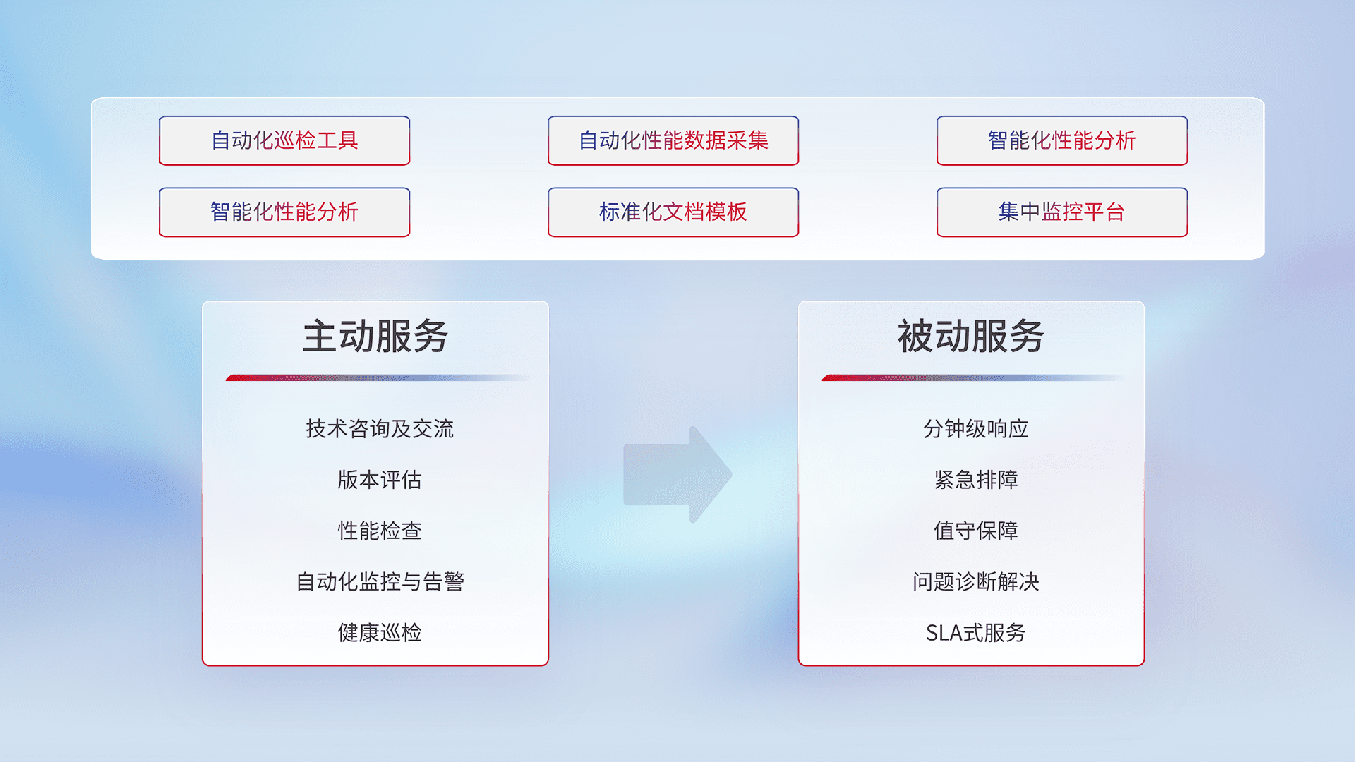 智能化工具和标准化文档,,,,保障服务质量,,提供主动服务(包含技术咨询、、版本评估、、性能检查、、自动化监控与告警、、健康巡检)和被动服务包含(分钟级响应、、紧急排障、、、、值守保障、、、、问题诊断解决、、、、SLA服务)。。。。